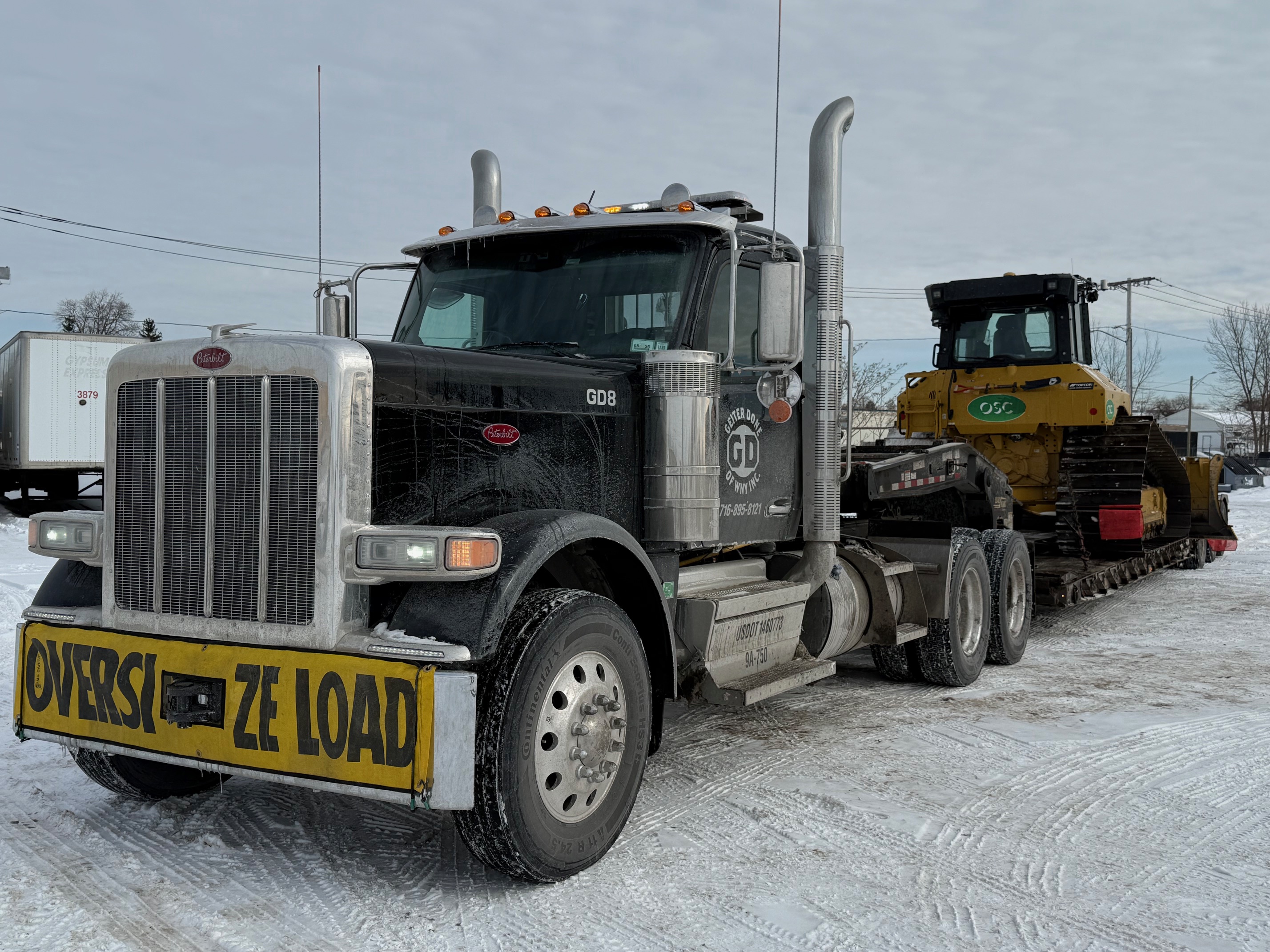 Congratulations to Jeff Dojnik from Geiter Done of Western New York! Jeff was out there getting it done in his Peterbilt 589, hauling a CAT D5 dozer. For this oversize move, he chose our genuine Ms. Carita SafeTruck OVERSIZE LOAD banners and flags — including one of our latest banner designs made specifically to work around tow hooks or license plates. Smart setup that keeps everything visible, compliant, and out of the way.