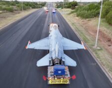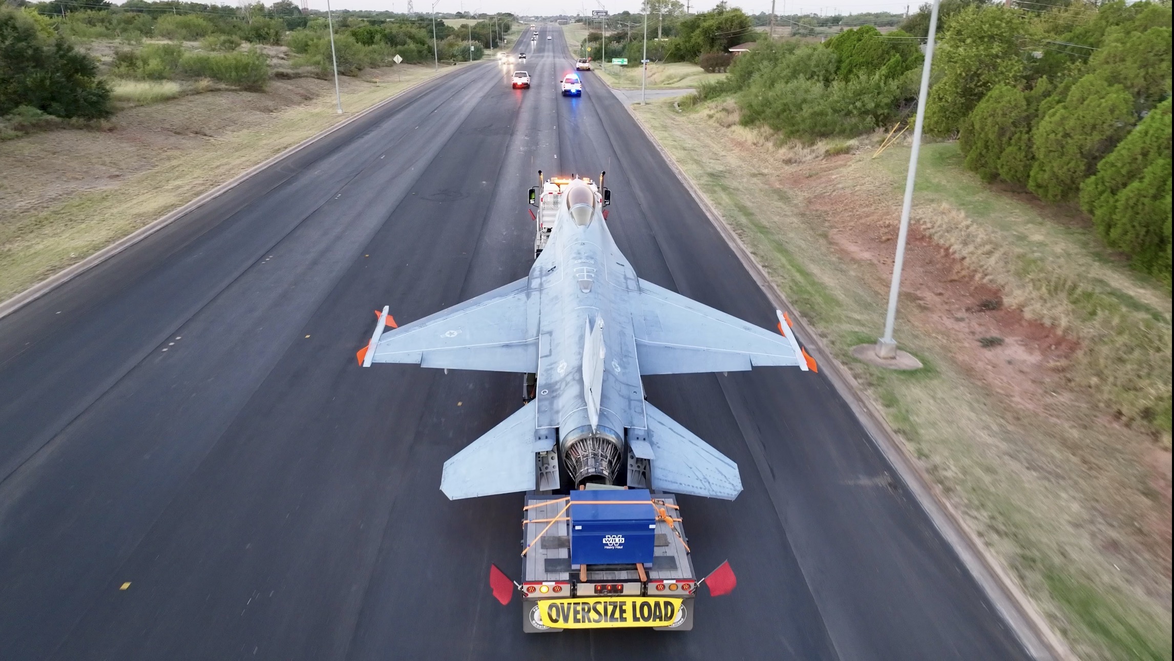 The second photo highlights an F-16 hauled from Sheppard AFB to Goodfellow AFB, covering 312 miles with dimensions of 33’ wide, 14’ tall, and 80’ long.
